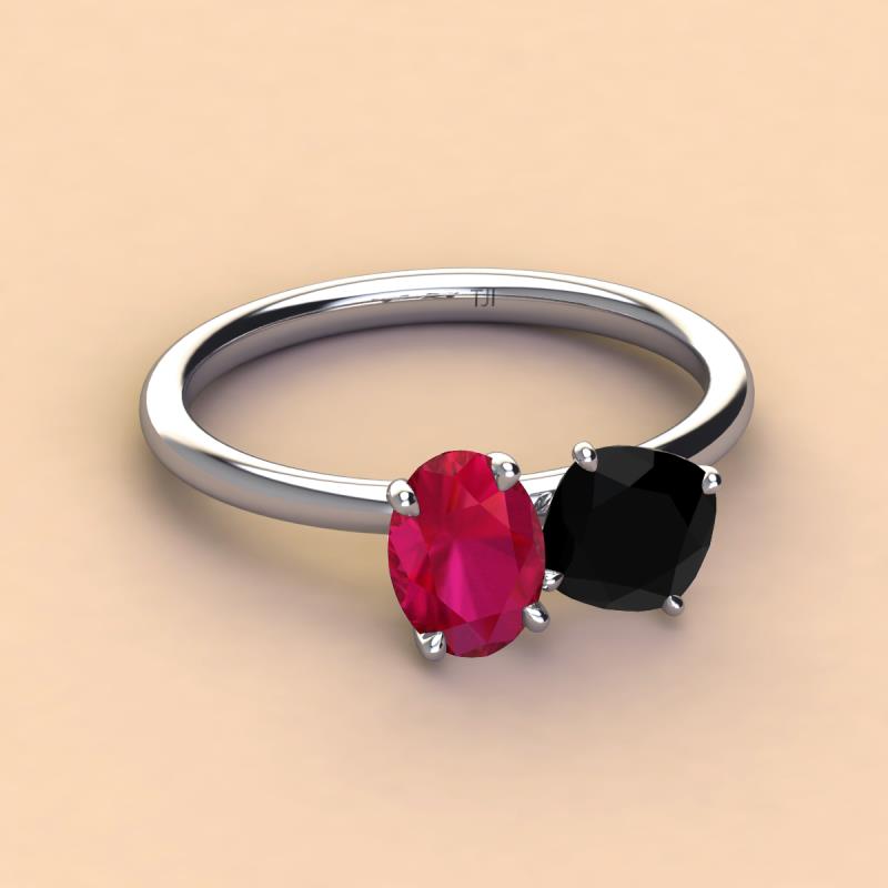 Two-stone Duo ring featuring an Oval shape Ruby and Cushion shape Black Onyx crafted beautifully that will effortlessly blend with her casual outfits and evening dresses.