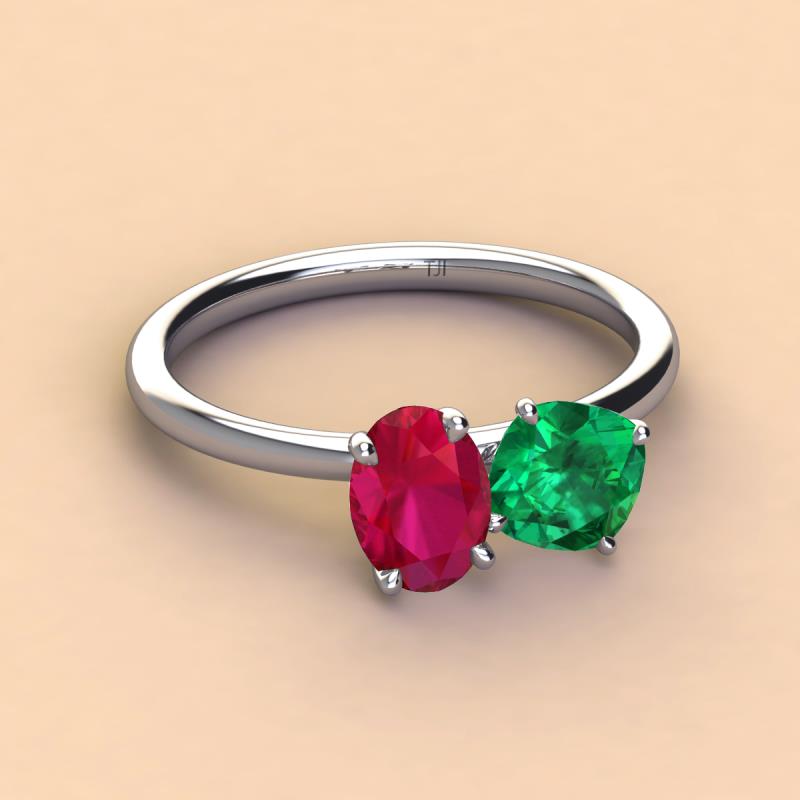 Two-stone Duo ring featuring an Oval shape Ruby and Cushion Shape Emerald crafted beautifully that will effortlessly blend with her casual outfits and evening dresses.