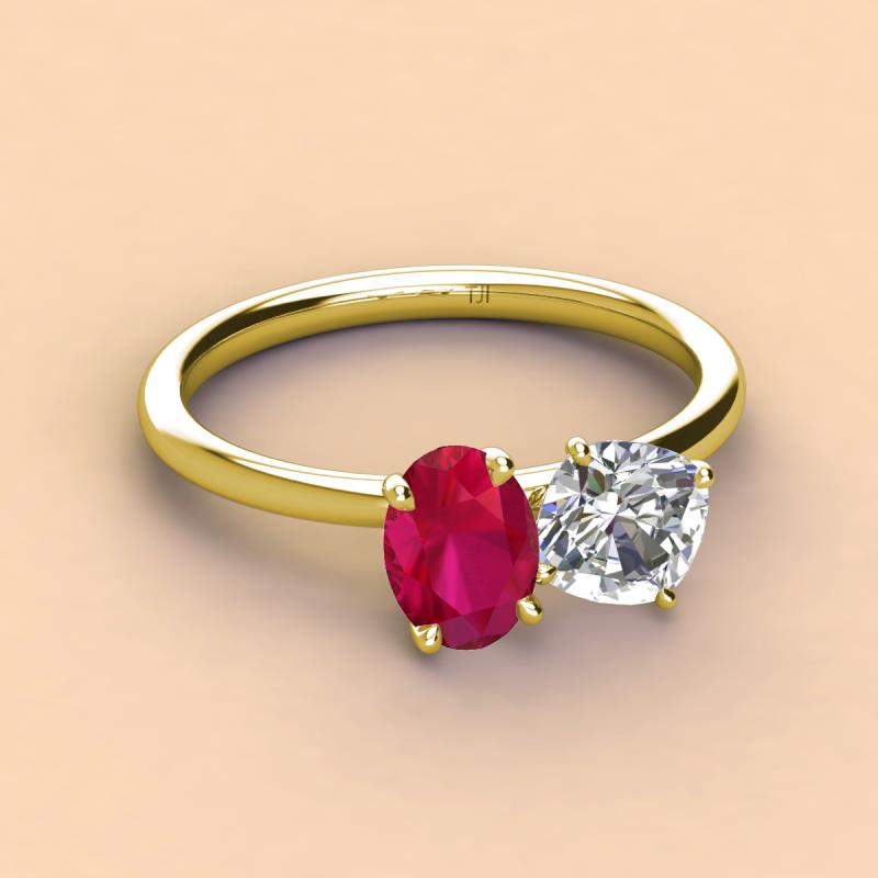 Two-stone Duo ring featuring an Oval shape Ruby and Cushion shape Forever Brilliant Moissanite crafted beautifully that will effortlessly blend with her casual outfits and evening dresses.