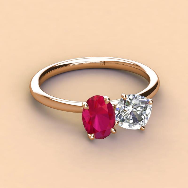 Two-stone Duo ring featuring an Oval shape Ruby and Cushion shape Forever Brilliant Moissanite crafted beautifully that will effortlessly blend with her casual outfits and evening dresses.
