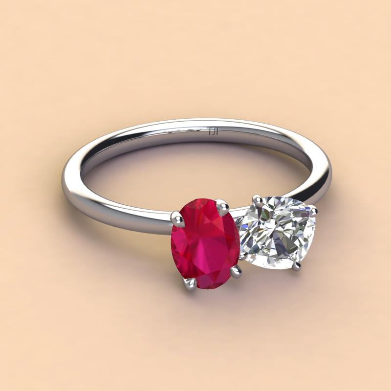 Two-stone Duo ring featuring an Oval shape Ruby and Cushion shape GIA Certified Diamond crafted beautifully that will effortlessly blend with her casual outfits and evening dresses.
