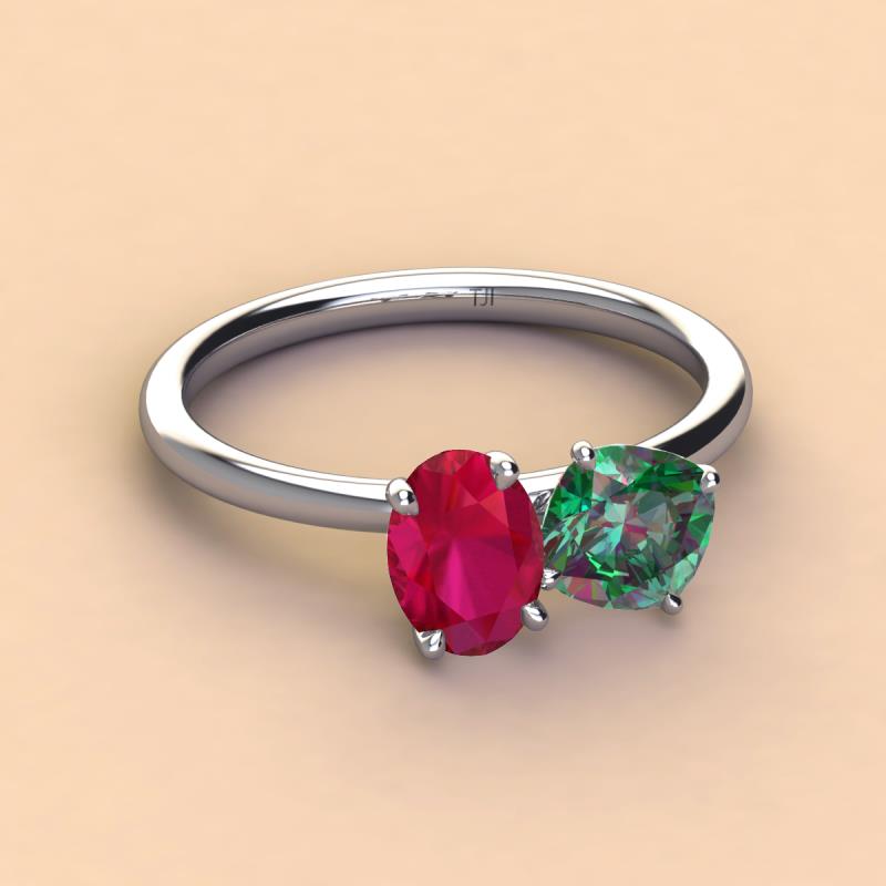 Two-stone Duo ring featuring an Oval shape Ruby and Cushion shape Lab Created Alexandrite crafted beautifully that will effortlessly blend with her casual outfits and evening dresses.