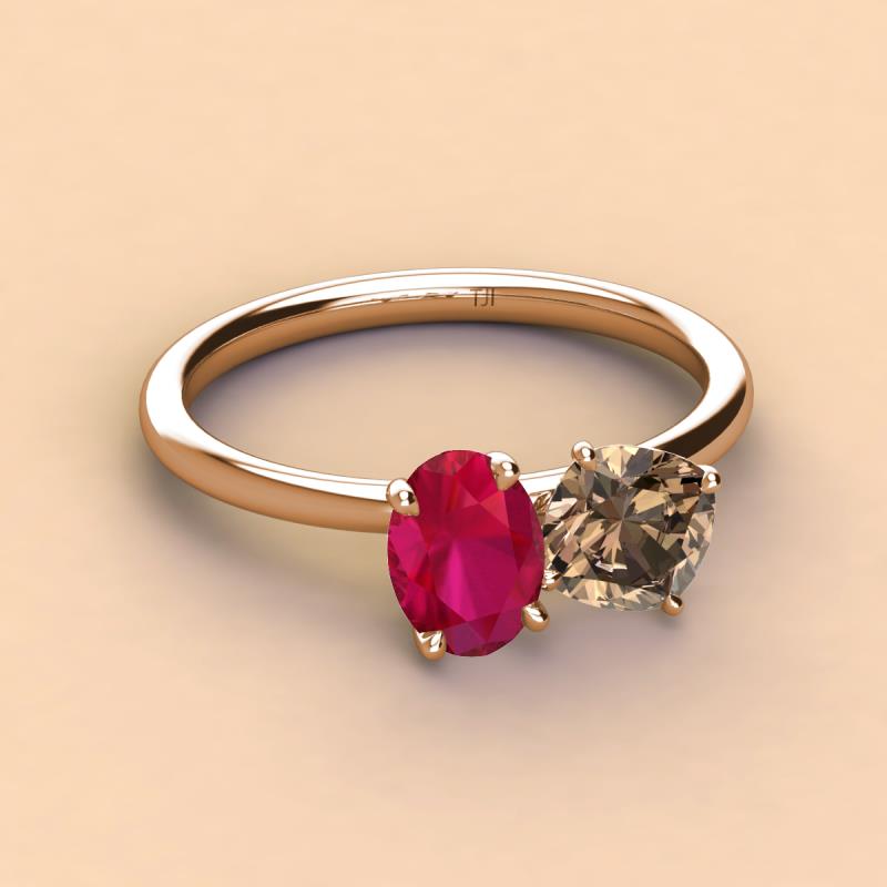 Two-stone Duo ring featuring an Oval shape Ruby and Cushion shape Smoky Quartz crafted beautifully that will effortlessly blend with her casual outfits and evening dresses.