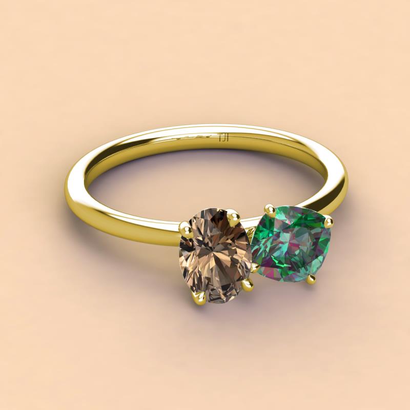 Two-stone Duo ring featuring an Oval shape Smoky Quartz and Cushion shape Lab Created Alexandrite crafted beautifully that will effortlessly blend with her casual outfits and evening dresses.