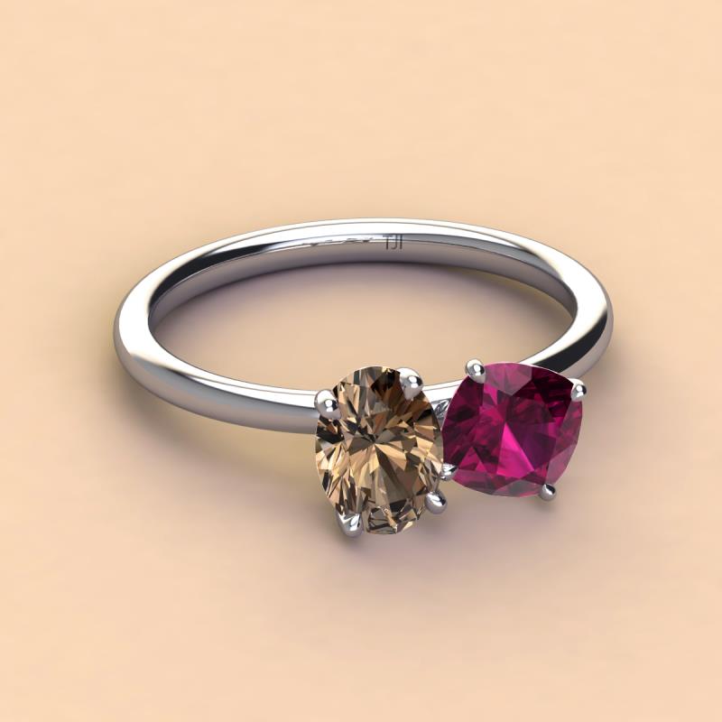 Two-stone Duo ring featuring an Oval shape Smoky Quartz and Cushion shape Rhodolite Garnet crafted beautifully that will effortlessly blend with her casual outfits and evening dresses.
