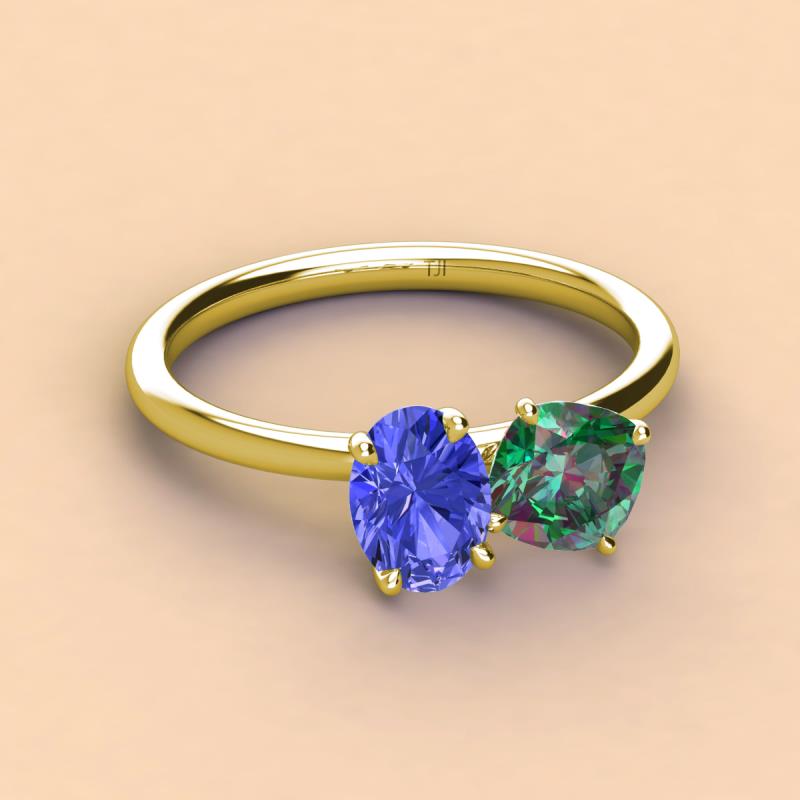 Two-stone Duo ring featuring an Oval shape Tanzanite and Cushion shape Lab Created Alexandrite crafted beautifully that will effortlessly blend with her casual outfits and evening dresses.