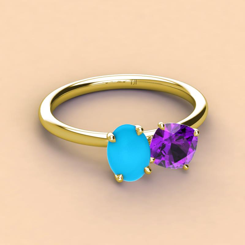 Two-stone Duo ring featuring an Oval shape Turquoise & Cushion shape Amethyst crafted beautifully that will effortlessly blend with her casual outfits and evening dresses.
