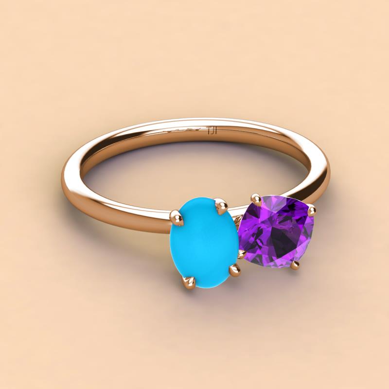 Two-stone Duo ring featuring an Oval shape Turquoise & Cushion shape Amethyst crafted beautifully that will effortlessly blend with her casual outfits and evening dresses.
