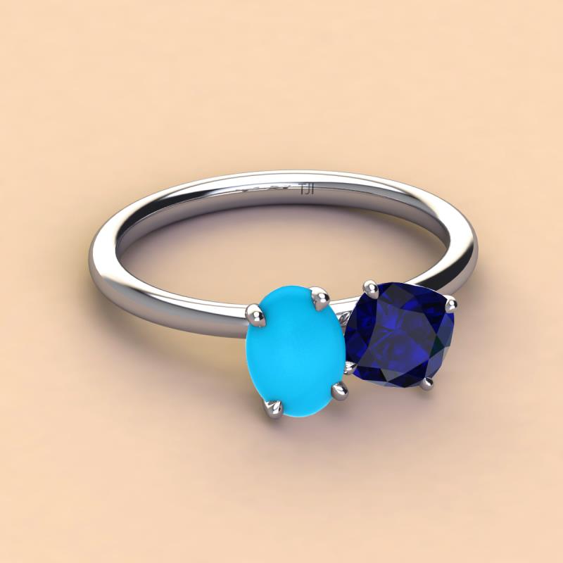 Two-stone Duo ring featuring an Oval shape Turquoise & Cushion shape Blue Sapphire crafted beautifully that will effortlessly blend with her casual outfits and evening dresses.