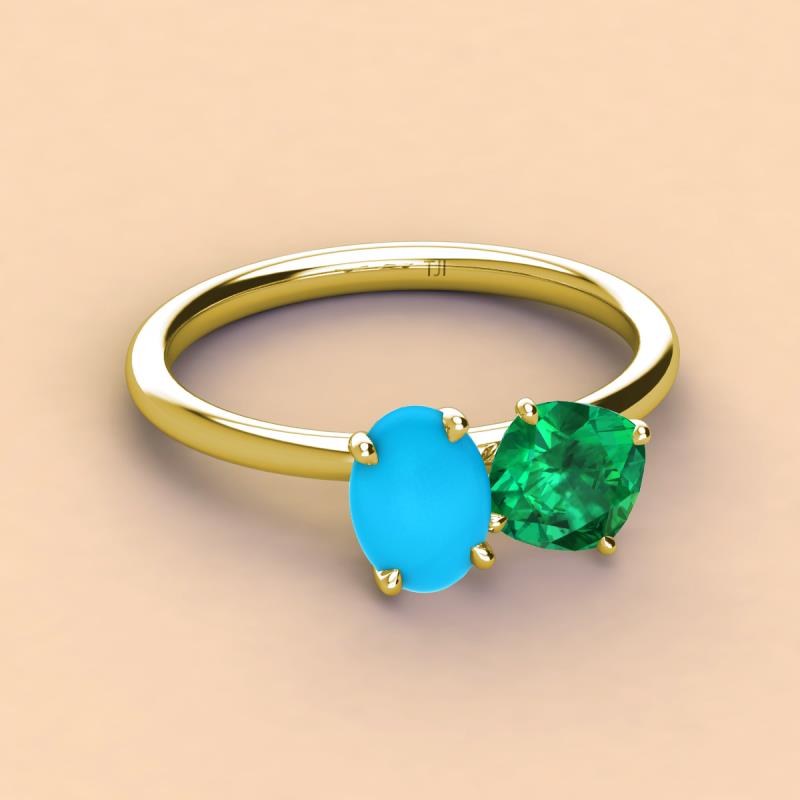 Two-stone Duo ring featuring an Oval shape Turquoise & Cushion shape Emerald crafted beautifully that will effortlessly blend with her casual outfits and evening dresses.
