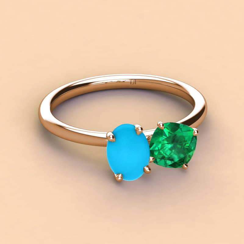 Two-stone Duo ring featuring an Oval shape Turquoise & Cushion shape Emerald crafted beautifully that will effortlessly blend with her casual outfits and evening dresses.