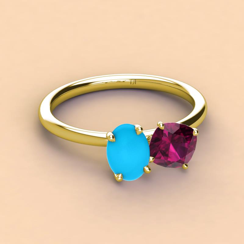 Two-stone Duo ring featuring an Oval shape Turquoise & Cushion shape Rhodolite Garnet crafted beautifully that will effortlessly blend with her casual outfits and evening dresses.