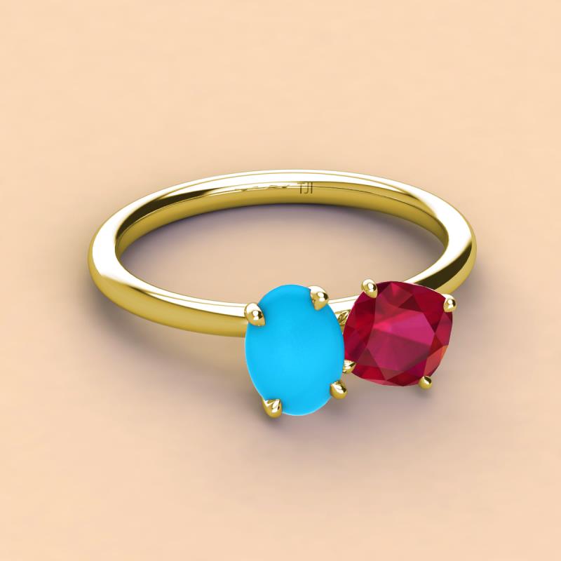 Two-stone Duo ring featuring an Oval shape Turquoise & Cushion shape Ruby crafted beautifully that will effortlessly blend with her casual outfits and evening dresses.