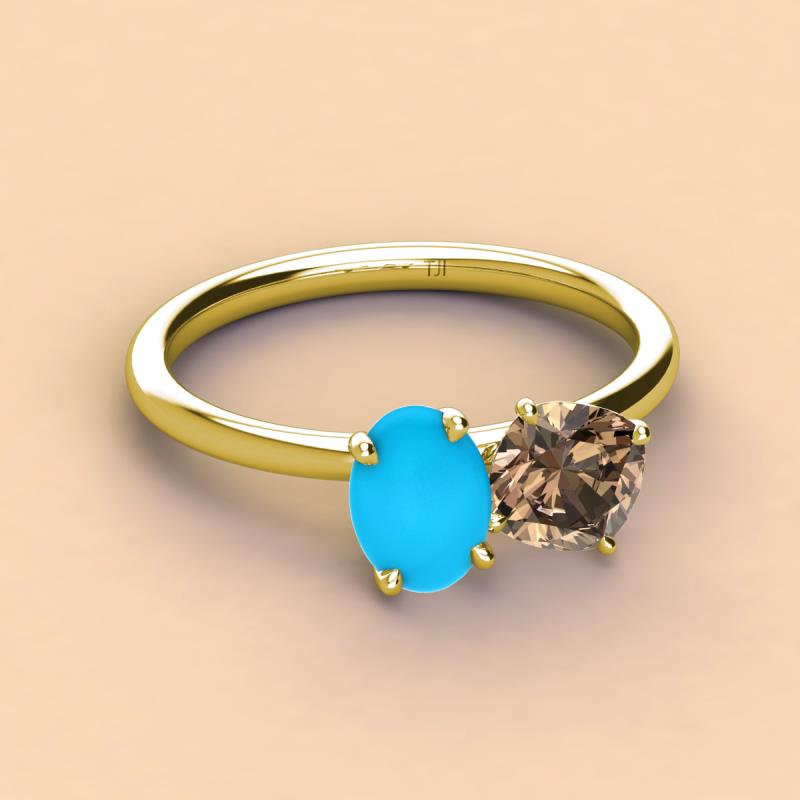 Two-stone Duo ring featuring an Oval shape Turquoise & Cushion shape Smoky Quartz crafted beautifully that will effortlessly blend with her casual outfits and evening dresses.