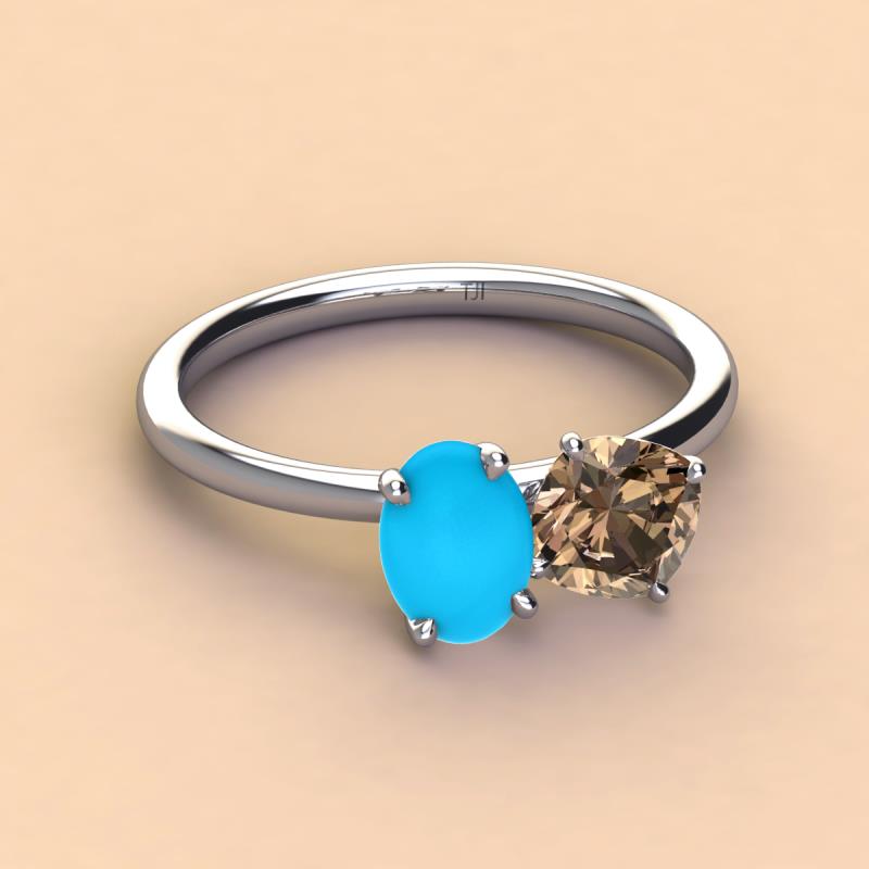 Two-stone Duo ring featuring an Oval shape Turquoise & Cushion shape Smoky Quartz crafted beautifully that will effortlessly blend with her casual outfits and evening dresses.