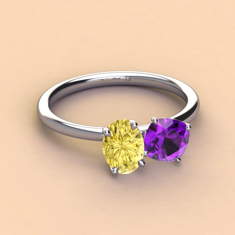 Two-stone Duo ring featuring an Oval shape Yellow Sapphire and Cushion shape Amethyst crafted beautifully that will effortlessly blend with her casual outfits and evening dresses.