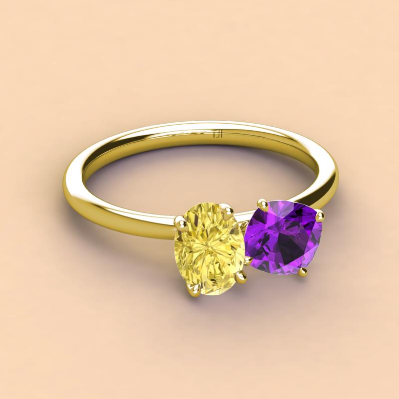 Two-stone Duo ring featuring an Oval shape Yellow Sapphire and Cushion shape Amethyst crafted beautifully that will effortlessly blend with her casual outfits and evening dresses.