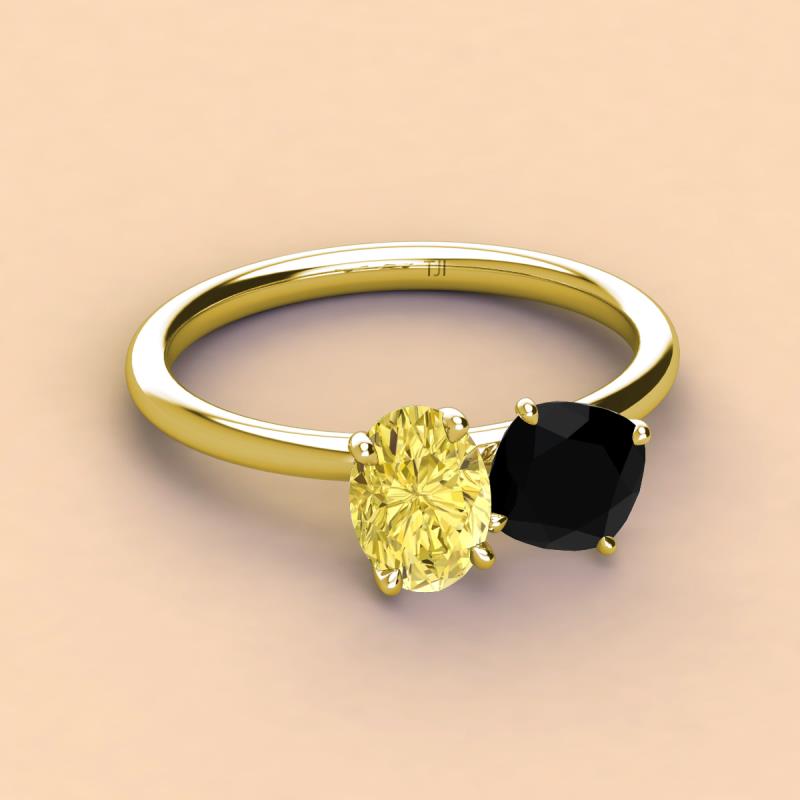 Two-stone Duo ring featuring an Oval shape Yellow Sapphire and Cushion shape Black Onyx crafted beautifully that will effortlessly blend with her casual outfits and evening dresses.