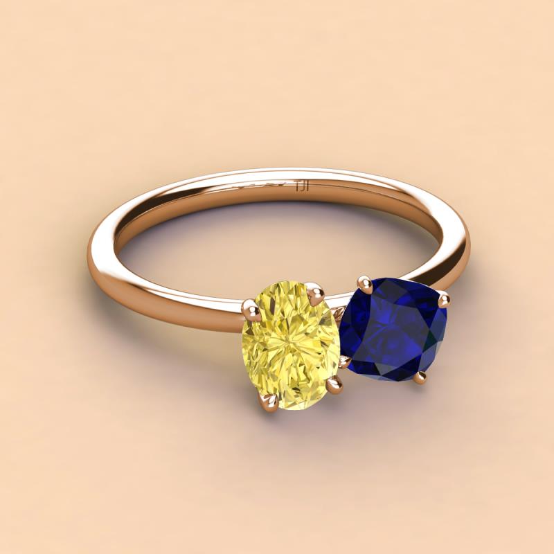 Two-stone Duo ring featuring an Oval shape Yellow Sapphire and Cushion shape Blue Sapphire crafted beautifully that will effortlessly blend with her casual outfits and evening dresses.