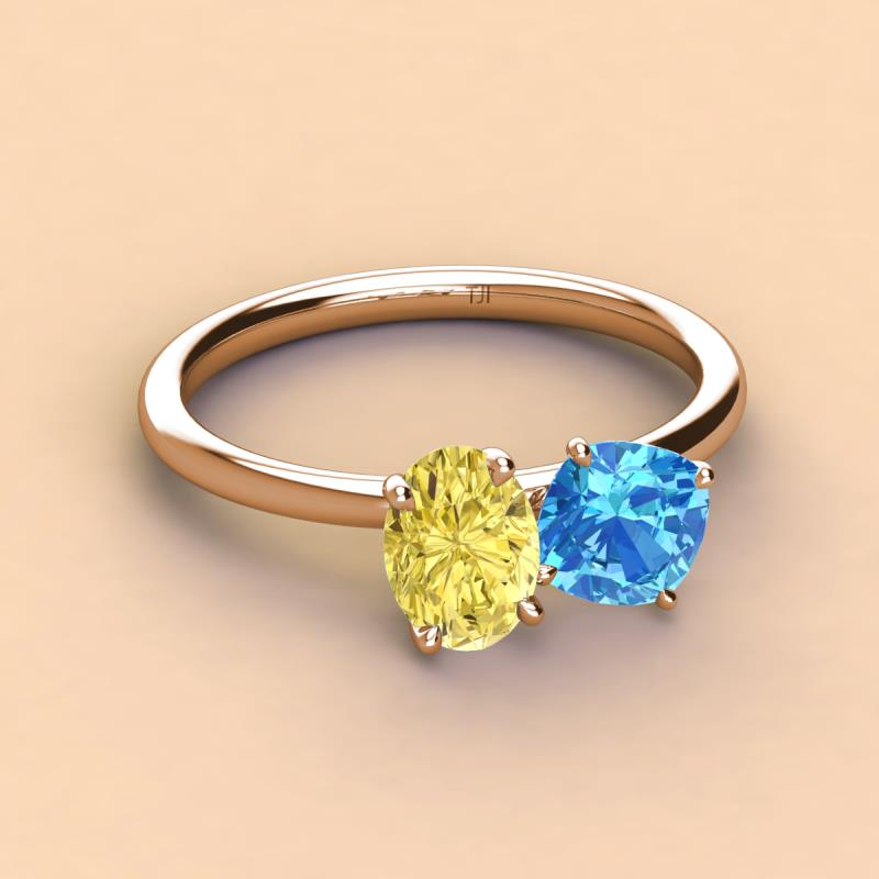Two-stone Duo ring featuring an Oval shape Yellow Sapphire and Cushion shape Blue Topaz crafted beautifully that will effortlessly blend with her casual outfits and evening dresses.