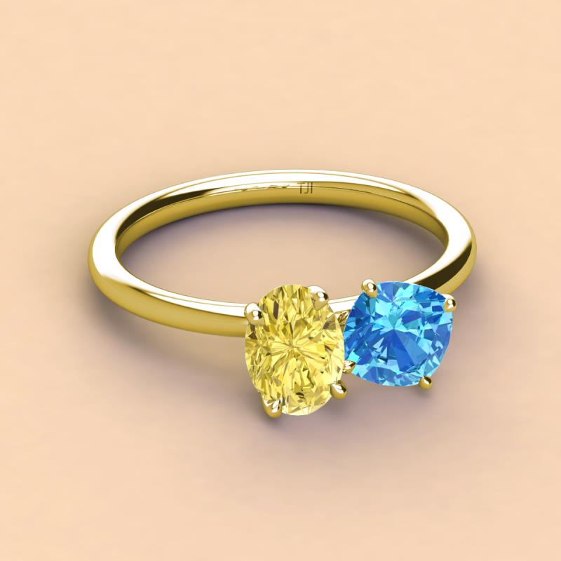 Two-stone Duo ring featuring an Oval shape Yellow Sapphire and Cushion shape Blue Topaz crafted beautifully that will effortlessly blend with her casual outfits and evening dresses.