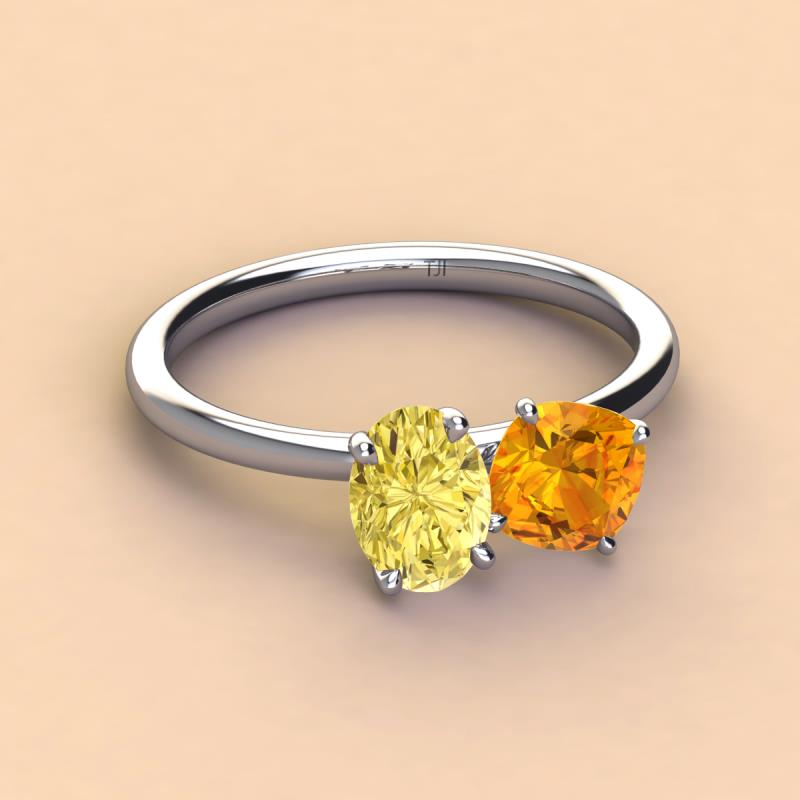 Two-stone Duo ring featuring an Oval shape Yellow Sapphire and Cushion shape Citrine crafted beautifully that will effortlessly blend with her casual outfits and evening dresses.