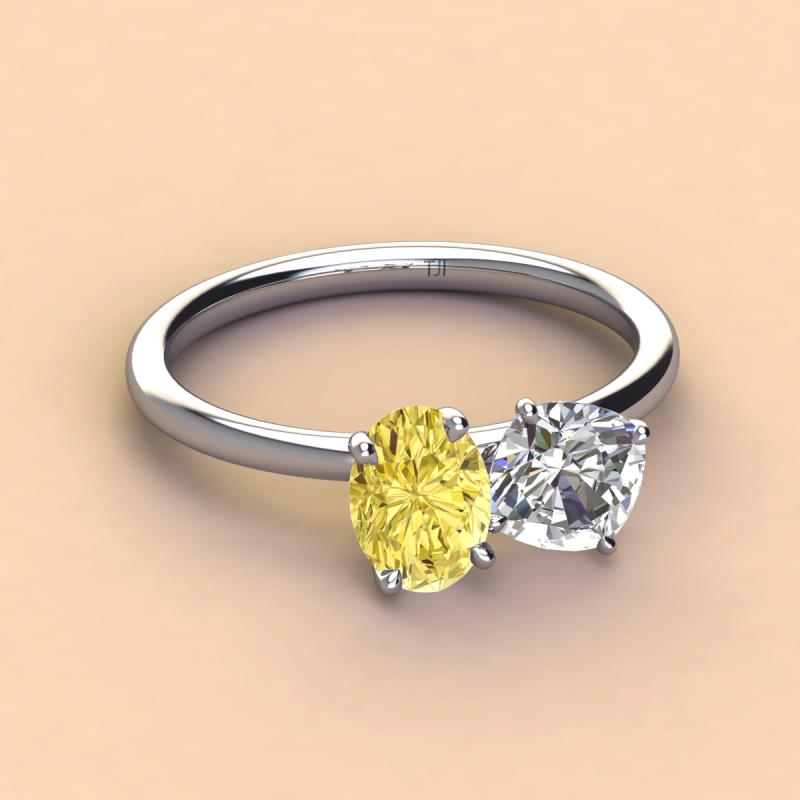 Two-stone Duo ring featuring an Oval shape Yellow Sapphire and Cushion shape Forever Brilliant Moissanite crafted beautifully that will effortlessly blend with her casual outfits and evening dresses.