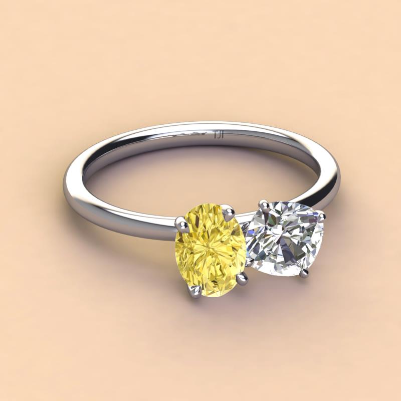Two-stone Duo ring featuring an Oval shape Yellow Sapphire and Cushion shape IGI Certified Lab Grown Diamond crafted beautifully that will effortlessly blend with her casual outfits and evening dresses.