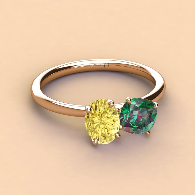 Two-stone Duo ring featuring an Oval shape Yellow Sapphire and Cushion shape Lab Created Alexandrite crafted beautifully that will effortlessly blend with her casual outfits and evening dresses.
