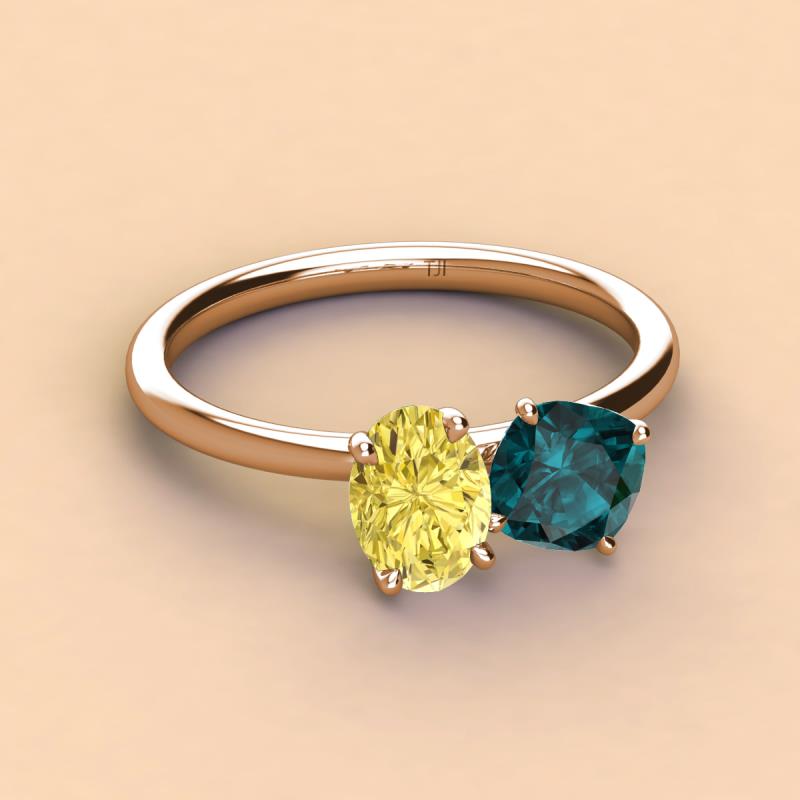 Two-stone Duo ring featuring an Oval shape Yellow Sapphire and Cushion shape London Blue Topaz crafted beautifully that will effortlessly blend with her casual outfits and evening dresses.