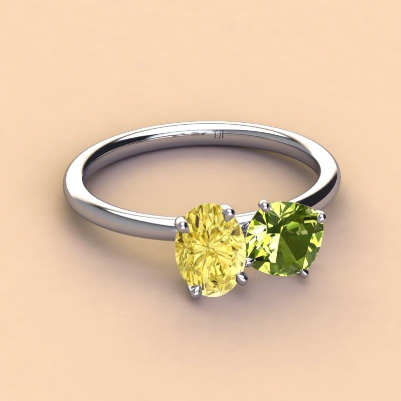 Two-stone Duo ring featuring an Oval shape Yellow Sapphire and Cushion shape Peridot crafted beautifully that will effortlessly blend with her casual outfits and evening dresses.