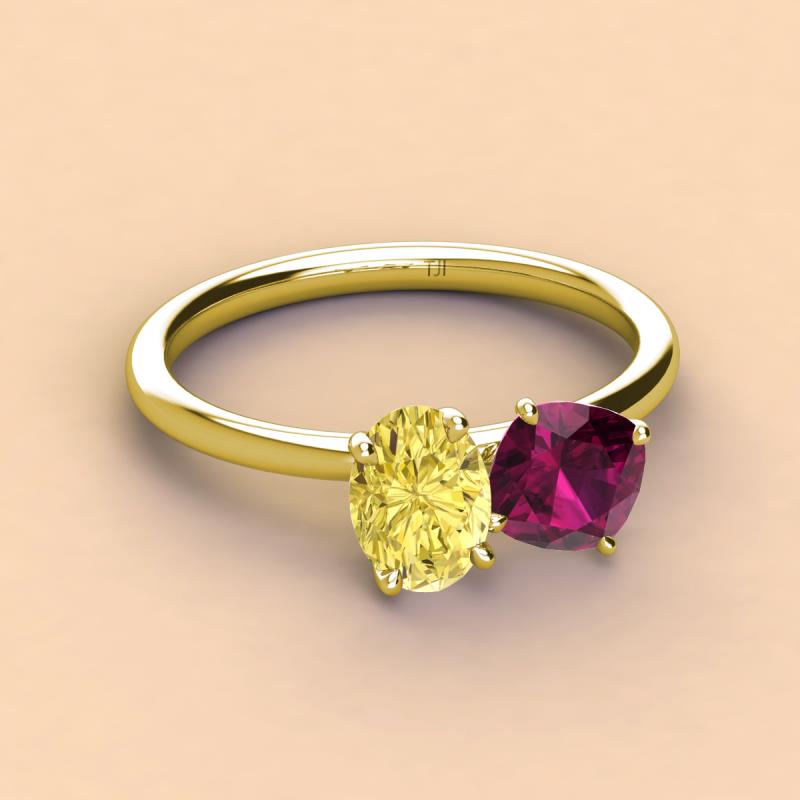Two-stone Duo ring featuring an Oval shape Yellow Sapphire and Cushion shape Rhodolite Garnet crafted beautifully that will effortlessly blend with her casual outfits and evening dresses.