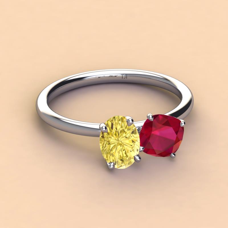 Two-stone Duo ring featuring an Oval shape Yellow Sapphire and Cushion shape Ruby crafted beautifully that will effortlessly blend with her casual outfits and evening dresses.