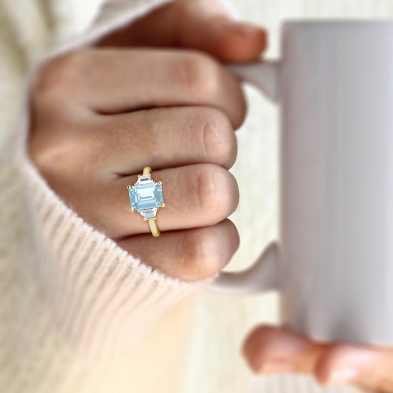 1.74 ctw Emerald Shape Aquamarine set in Tiger Claw Prong and accented Trapezoid Shape Lab Grown Diamonds Women Three Stone Engagement Ring in 14K Yellow Gold More Details ...