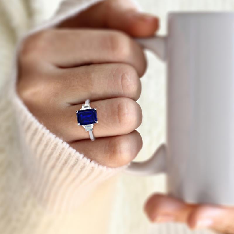 1.84 ctw Emerald Shape Blue Sapphire set in Tiger Claw Prong and accented Trapezoid Shape Lab Grown Diamonds Women Three Stone Engagement Ring in 14K White Gold More Details ...