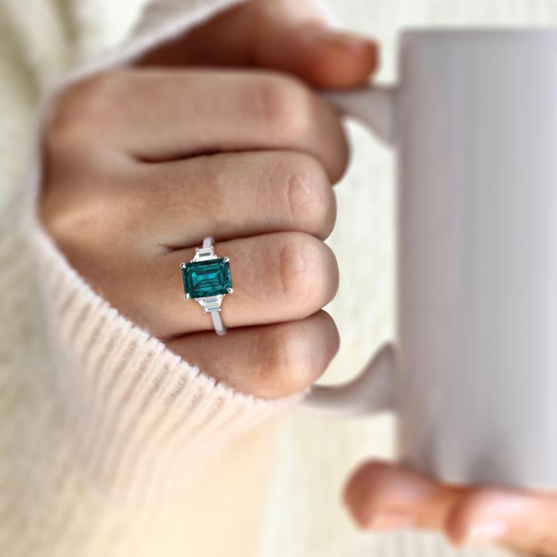 2.34 ctw Emerald Shape London Blue Topaz set in Tiger Claw Prong and accented Trapezoid Shape Lab Grown Diamonds Women Three Stone Engagement Ring in 14K White Gold More Details ...
