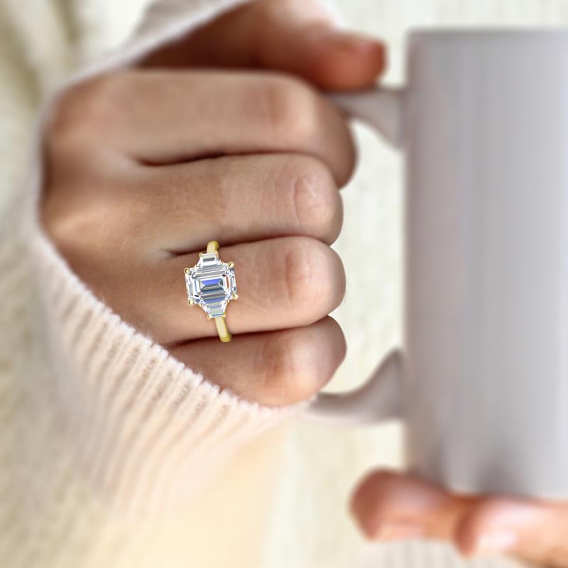 A masterpiece of sophistication, this three-stone design exudes timeless allure. Flanked by two trapezoid-shaped lab-grown diamonds, the center Moissanite stone shines with unmatched brilliance.