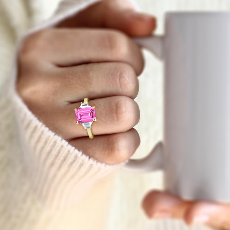 1.84 ctw Emerald Shape Pink Sapphire set in Tiger Claw Prong and accented Trapezoid Shape Lab Grown Diamonds Women Three Stone Engagement Ring in 14K Yellow Gold More Details ...