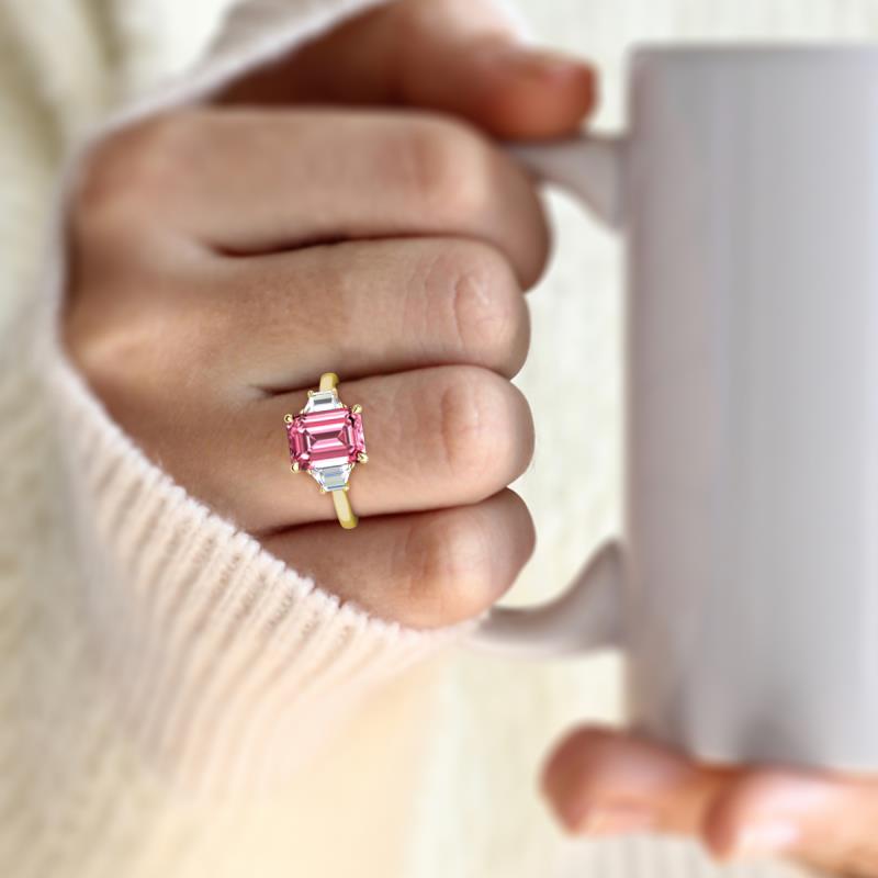 1.99 ctw Emerald Shape Pink Tourmaline set in Tiger Claw Prong and accented Trapezoid Shape Lab Grown Diamonds Women Three Stone Engagement Ring in 14K Yellow Gold More Details ...