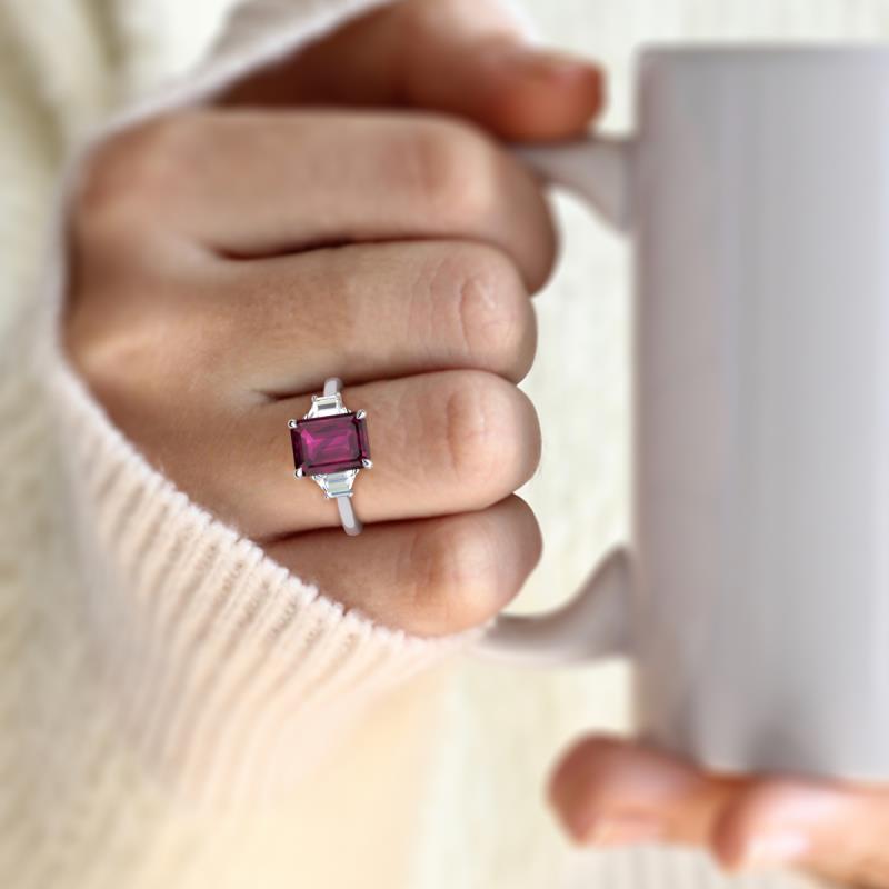 2.34 ctw Emerald Shape Rhodolite Garnet set in Tiger Claw Prong and accented Trapezoid Shape Lab Grown Diamonds Women Three Stone Engagement Ring in 14K White Gold More Details ...