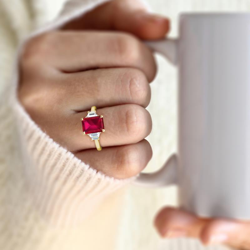 1.84 ctw Emerald Shape Ruby set in Tiger Claw Prong and accented Trapezoid Shape Lab Grown Diamonds Women Three Stone Engagement Ring in 18K Yellow Gold More Details ...