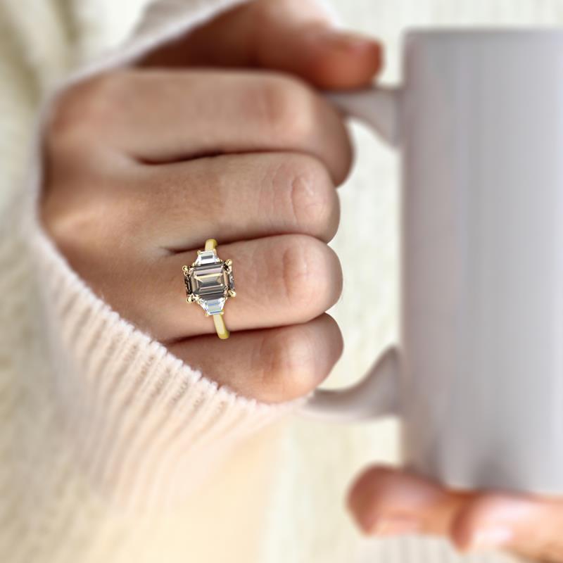 2.04 ctw Emerald Shape Smoky Quartz set in Tiger Claw Prong and accented Trapezoid Shape Lab Grown Diamonds Women Three Stone Engagement Ring in 18K Yellow Gold More Details ...