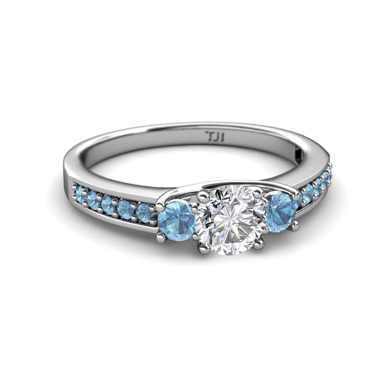 If your love glows timeless for her, let her know it with this Three Stone Engagement Ring which Centers Diamond flanked with two Aquamarine along with small side Aquamarine to treasure the most beautiful moments of life.