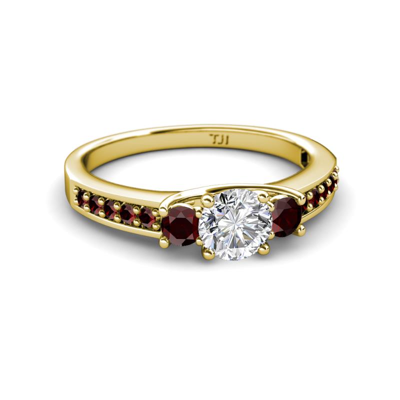 Round Diamond and Red Garnet 1 ctw Womens Three Stone Engagement Ring with Red Garnet on Side Bar 14K Yellow Gold More Details ...