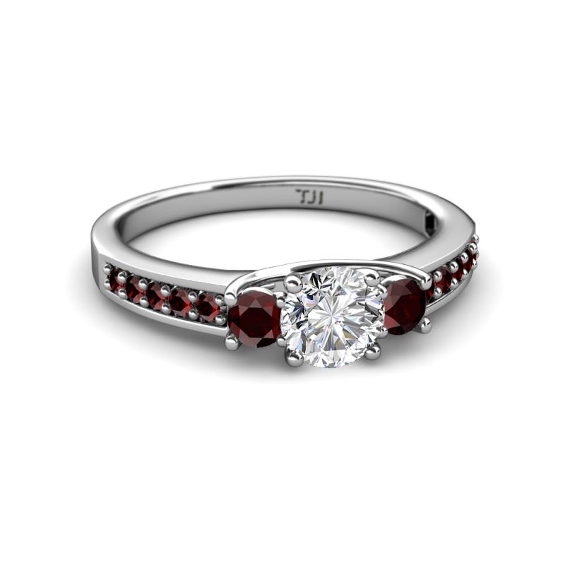 If your love glows timeless for her, let her know it with this 1.10 cttw Three Stone Engagement Ring which Centers Diamond flanked with two Red Garnet along with small side Red Garnet to treasure the most beautiful moments of life.