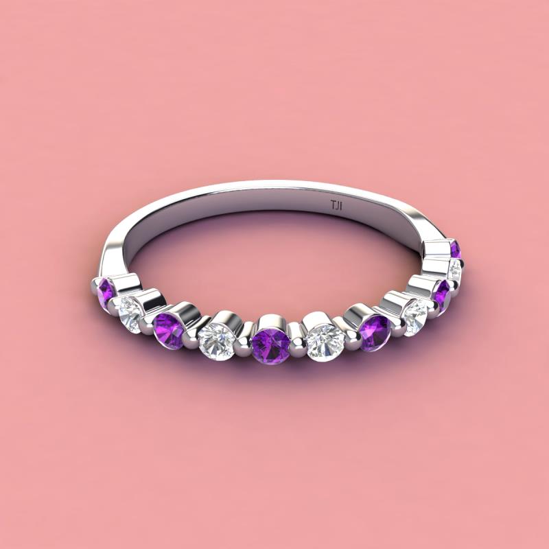 A Jewelry is a way of keeping memories alive. Do it with this Dazzling 11 Stone Wedding Band with a series of Round Sparkling Amethyst and Lab Grown Diamond delicately crafted in Shared-Prong setting.The perfect match to your engagement ring, or you can wear it stand alone.