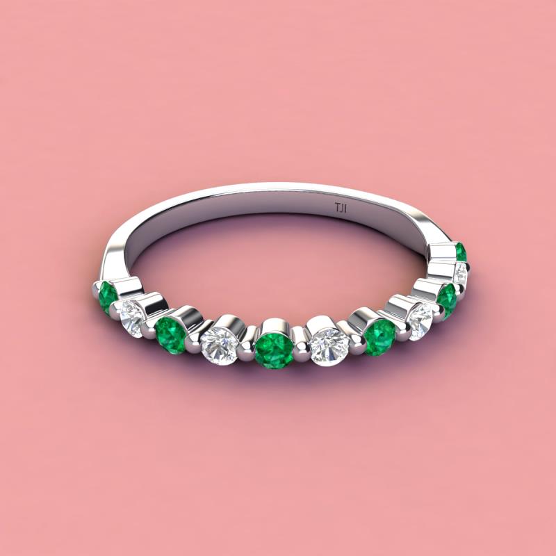 A Jewelry is a way of keeping memories alive. Do it with this Dazzling 11 Stone Wedding Band with a series of Round Sparkling Emerald and Lab Grown Diamond delicately crafted in Shared-Prong setting.The perfect match to your engagement ring, or you can wear it stand alone.