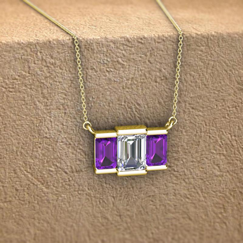 Represent your undying love and commitment with this charming 3 Stone Pendant in 14K Yellow Gold. The necklace displays Center Emerald Shape GIA Certified Diamond accompanied with two emerald shape Amethyst in channel setting. It perfectly symbolizes the past, present and the future.