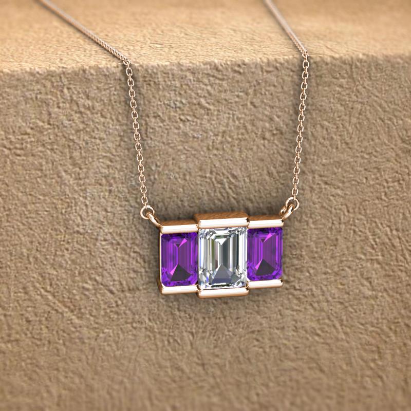 Represent your undying love and commitment with this charming 3 Stone Pendant in 18K Rose Gold. The necklace displays Center Emerald Shape GIA Certified Diamond accompanied with two emerald shape Amethyst in channel setting. It perfectly symbolizes the past, present and the future.