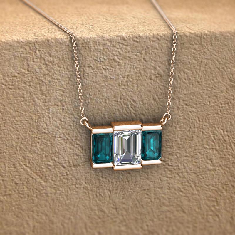 Represent your undying love and commitment with this charming 3 Stone Pendant in 14K Rose Gold. The necklace displays Center Emerald Shape GIA Certified Diamond accompanied with two emerald shape London Blue Topaz in channel setting. It perfectly symbolizes the past, present and the future.